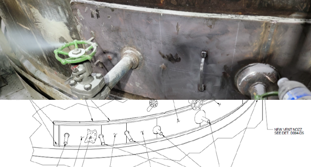 2. Approach: Performed alteration calculations per ASME and NBIC rules. Evaluated the nozzle and local insert plate’s capacity for piping loads using WRC Bulletin 537 and hand calculations.